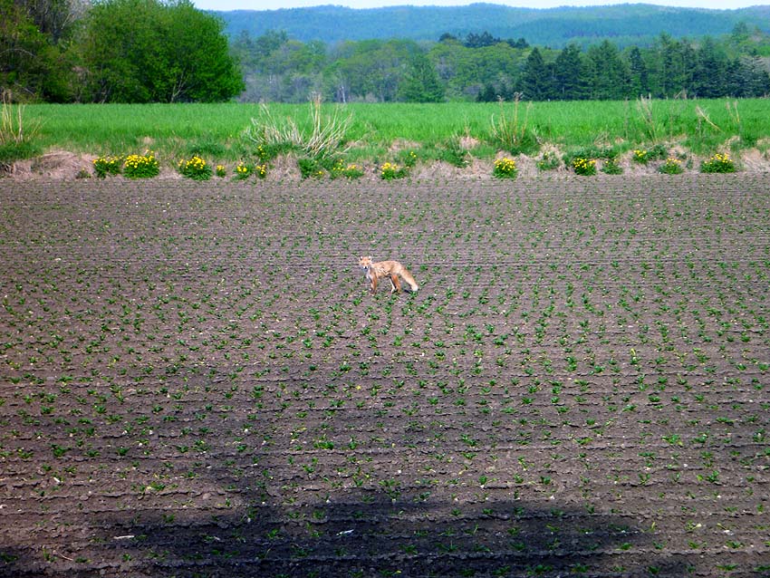 「キタキツネ」がビックリして藪の中から飛び出した!